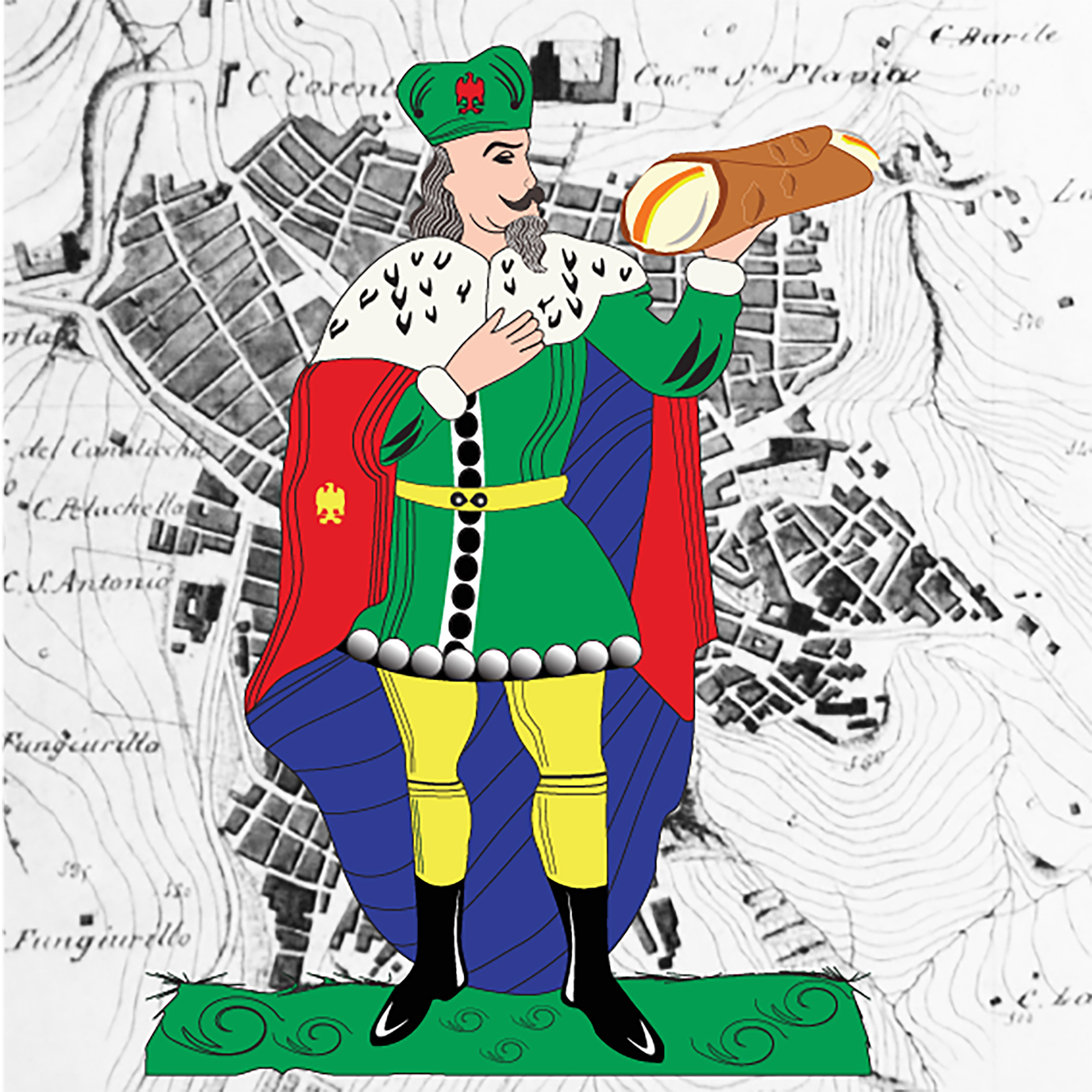 E’ il re di denari vestito con i colori della bandiera di Caltanissetta che sorregge un cannolo, dolce tipico siciliano. Il nisseno è uno dei territori siciliani più ricco di dolci unici, dalla crocetta al torrone al rollò, ed ad oggi detiene il primato mondiale del cannolo più lungo al mondo mai realizzato (anno 2022). Ogni vittoria è una buona carta da giocare.