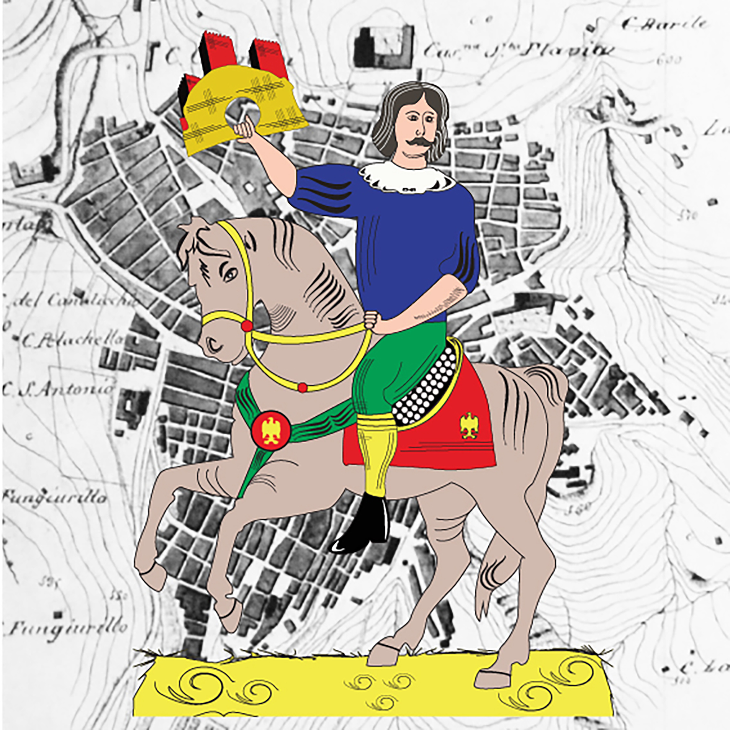 E’ il cavaliere vestito con i colori della bandiera di Caltanissetta che sorregge il Castello Pietrarossa, uno dei più antichi edifici della città. L’origine del castello è tuttora oggetto di dibattito in quanto è difficile ricostruirne la storia (se bizantina, saracena o pre-ellenica).Quello che sappiamo è che il nucleo originale del castello fu edificato dai bizantini tra il 750 e l'800, in seguito cadde in mano agli arabi che lo ribattezzarono Qalat-an-Nisa, castello delle donne, da cui il nome della città prende origine. Nella notte del 27 Febbraio 1567, forse per una scossa di terremoto, il castello crollò e, mentre una parte del castello venne conservata con lavori di manutenzione, un’altra venne utilizzata come cava di pietra. La pietre del castello infatti verranno utilizzate per le principali costruzioni della città. La distruzione del castello decretò quindi l’inizio di una nuova rinascita. Il passato precede sempre il futuro ed anche questa è una buona carta da giocare.